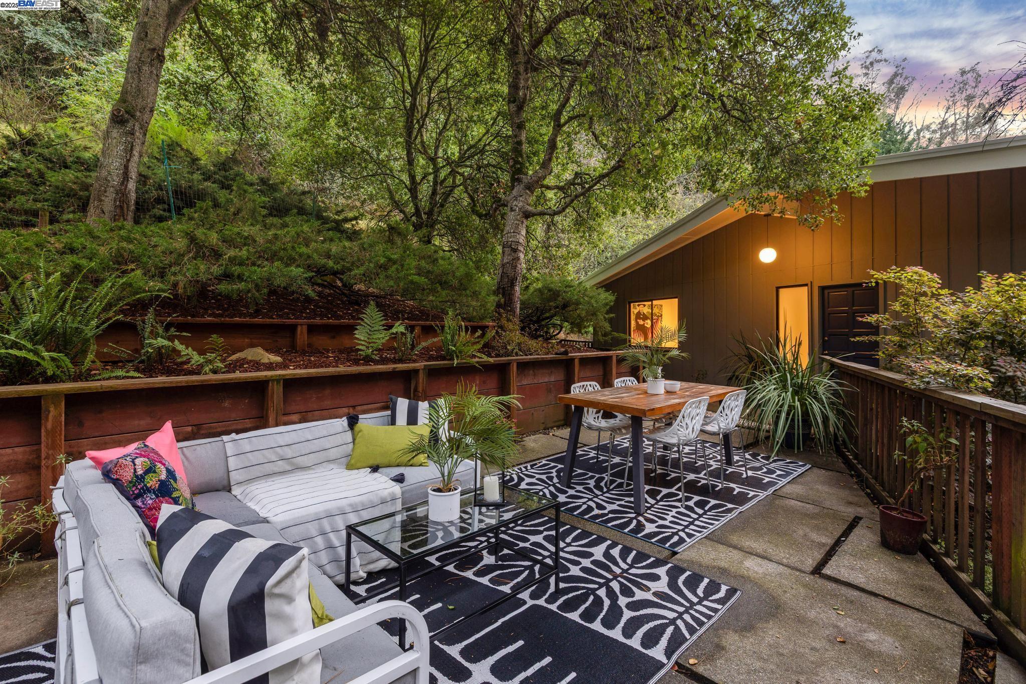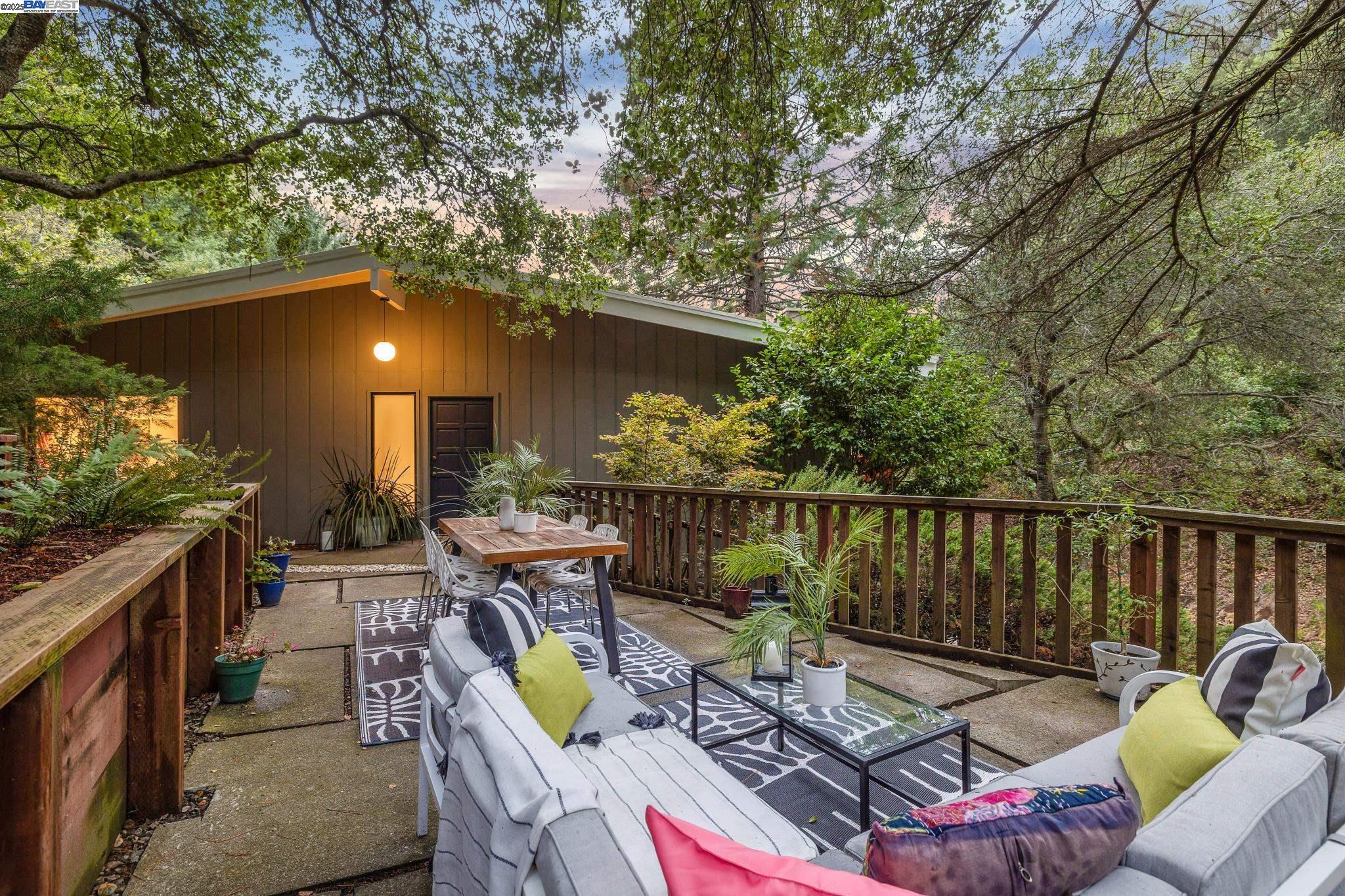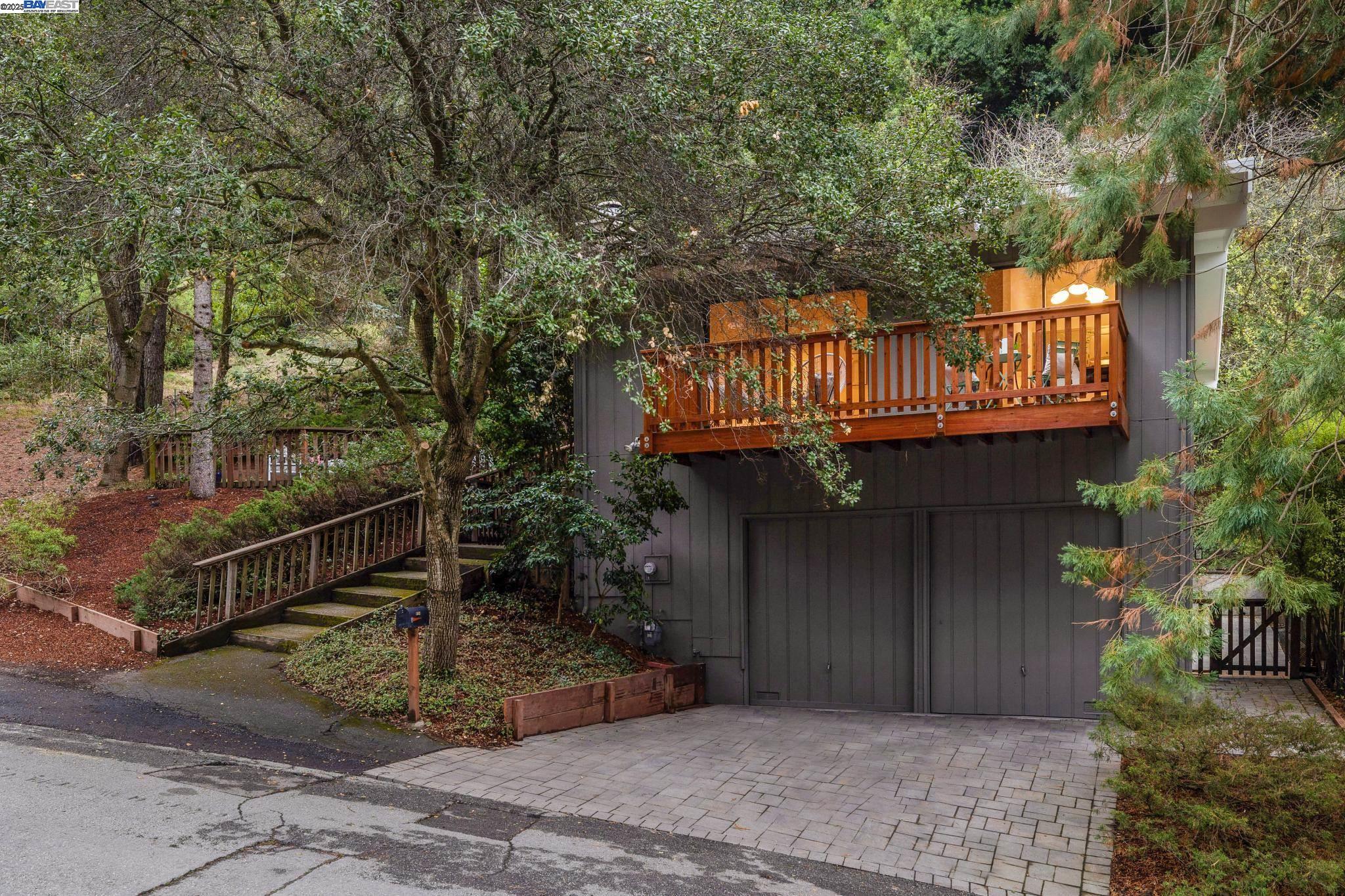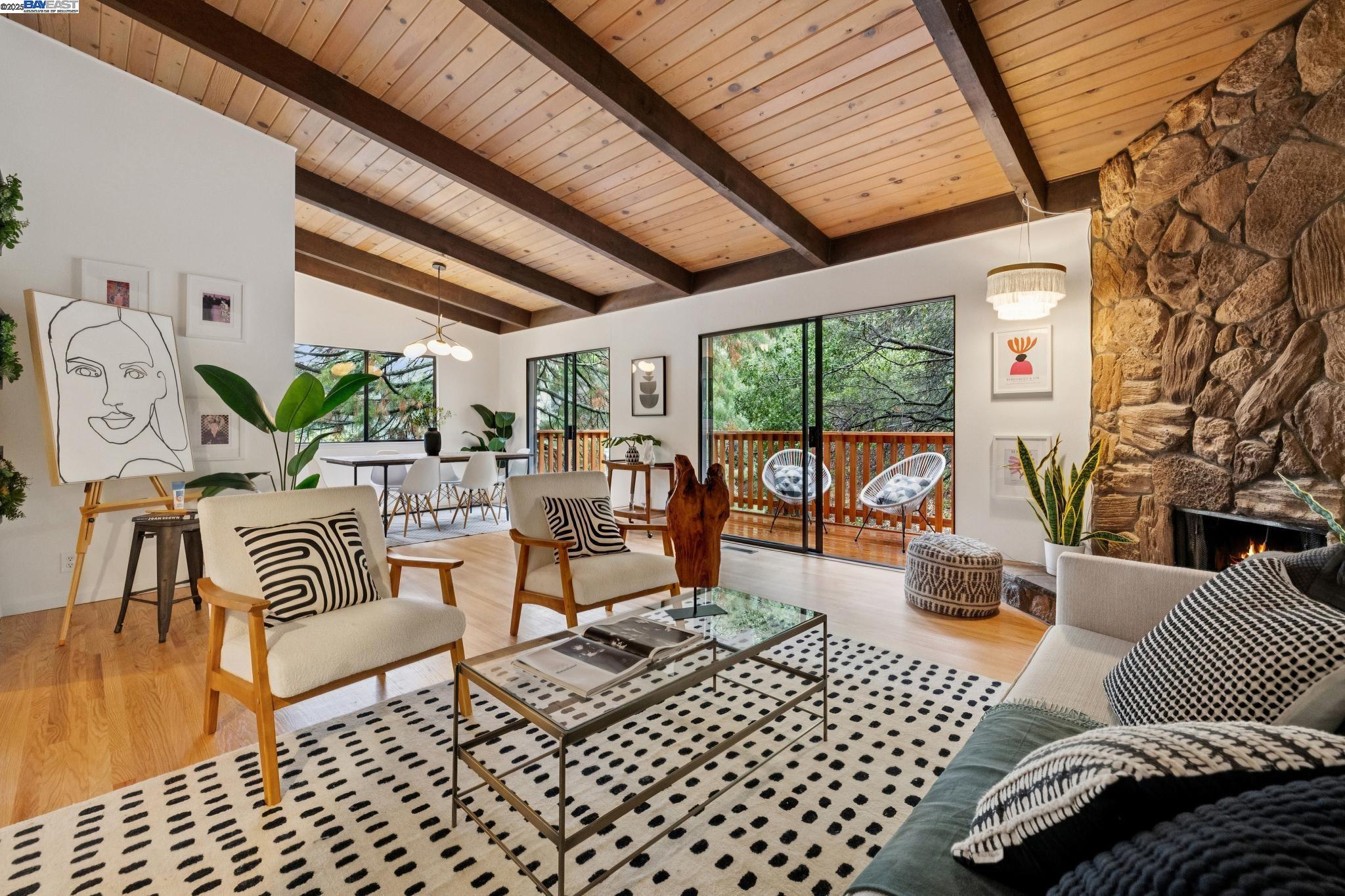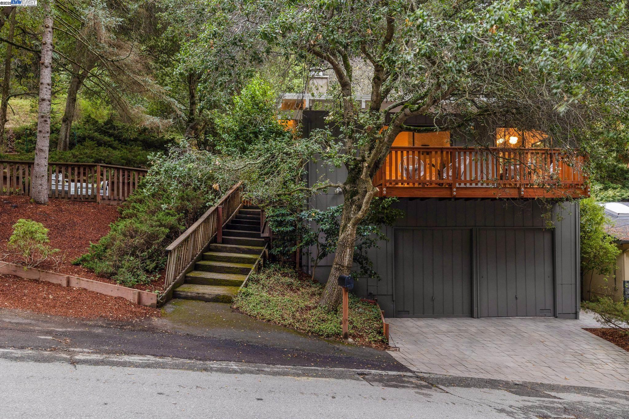 Surrounded by redwoods and beautiful oaks, this upgraded 3BD/2.5BA Montclair home is now transparently priced! The 1709 SQFT home welcomes you with a spacious terrace where you can unwind or entertain encircled by majestic trees and a terraced garden. Step inside the home's open living area that compliments the setting's natural beauty with a soaring beamed ceiling, a statement stone fireplace, and two sliding glass doors onto a new deck that spans the living and dining area. The adjacent stylish kitchen, the open floor plan, and wide deck offer seamless flow and indoor/outdoor living. New hardwood floors continue down the hall featuring a full bath with tub, one bedroom with a garden picture window, and a bright primary bedroom with an ensuite bath. Both bedrooms enjoy roomy closets and new recessed lighting. Downstairs find another private bedroom, half bath, laundry room, and indoor access to the oversized 2-car garage. Venture out the side door to relax or play on the newly refurbished back patio with pavers and raised garden beds. This wooded sanctuary is close to top-rated public schools, the Montclair Swim Club, and lively Montclair Village for shopping and dining; and East Bay Parks for recreation with miles of beautiful trails.