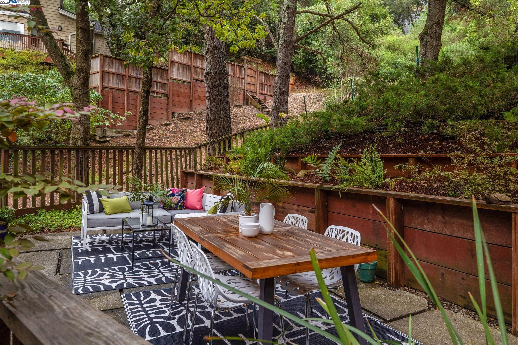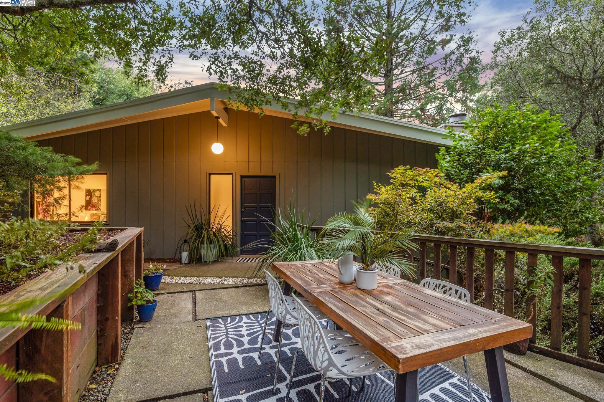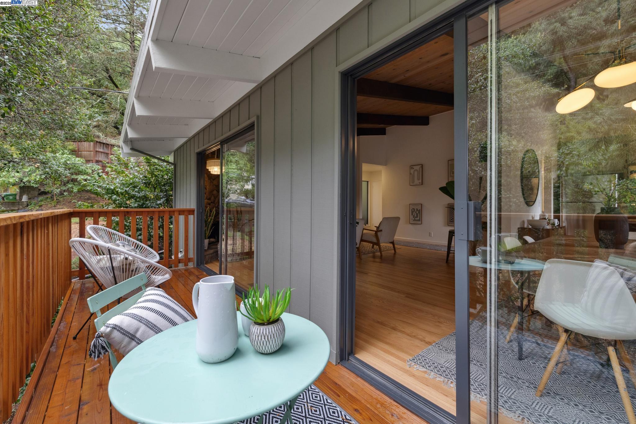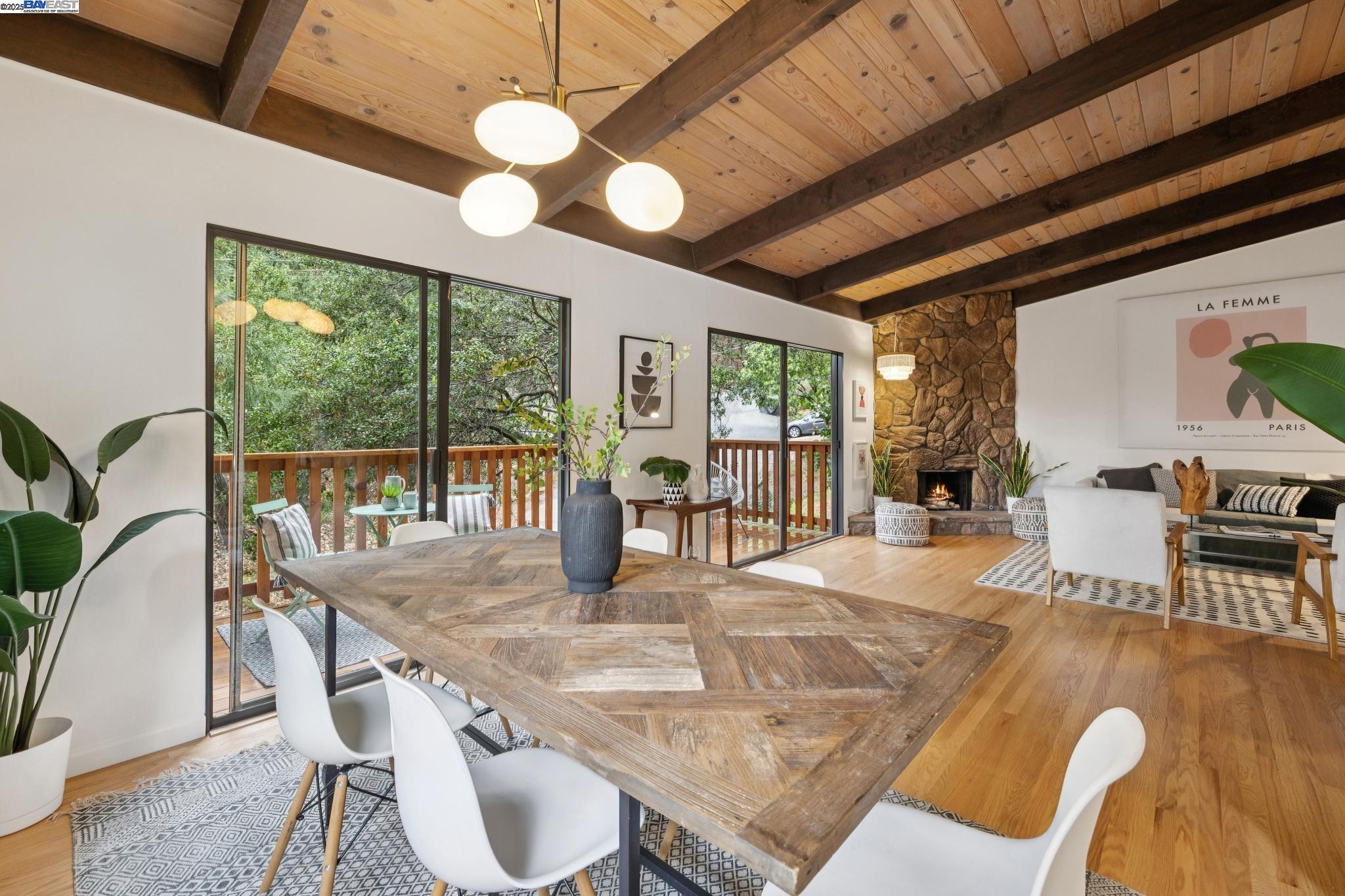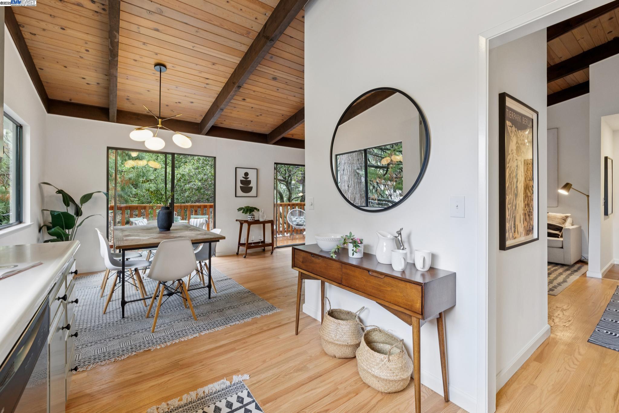Surrounded by redwoods and beautiful oaks, this upgraded 3BD/2.5BA Montclair home is now transparently priced! The 1709 SQFT home welcomes you with a spacious terrace where you can unwind or entertain encircled by majestic trees and a terraced garden. Step inside the home's open living area that compliments the setting's natural beauty with a soaring beamed ceiling, a statement stone fireplace, and two sliding glass doors onto a new deck that spans the living and dining area. The adjacent stylish kitchen, the open floor plan, and wide deck offer seamless flow and indoor/outdoor living. New hardwood floors continue down the hall featuring a full bath with tub, one bedroom with a garden picture window, and a bright primary bedroom with an ensuite bath. Both bedrooms enjoy roomy closets and new recessed lighting. Downstairs find another private bedroom, half bath, laundry room, and indoor access to the oversized 2-car garage. Venture out the side door to relax or play on the newly refurbished back patio with pavers and raised garden beds. This wooded sanctuary is close to top-rated public schools, the Montclair Swim Club, and lively Montclair Village for shopping and dining; and East Bay Parks for recreation with miles of beautiful trails.