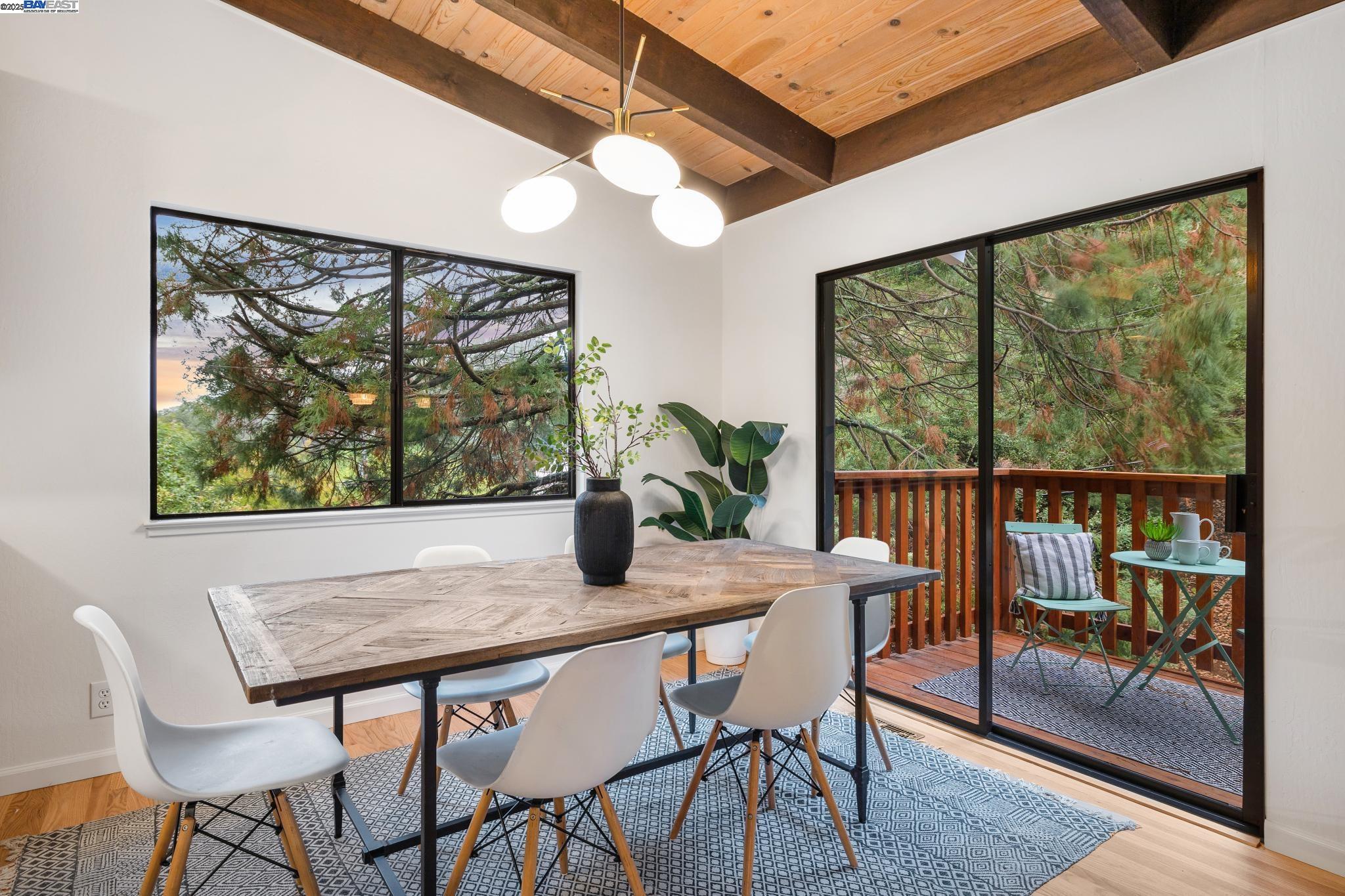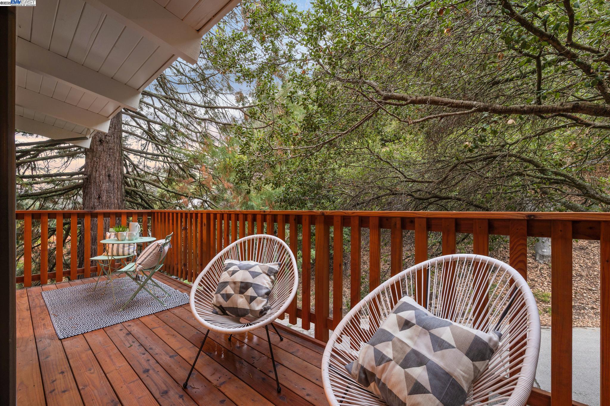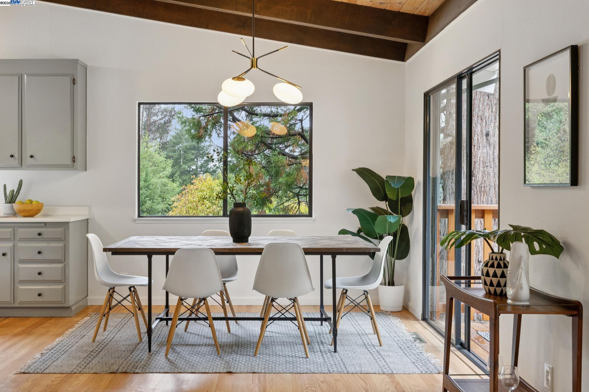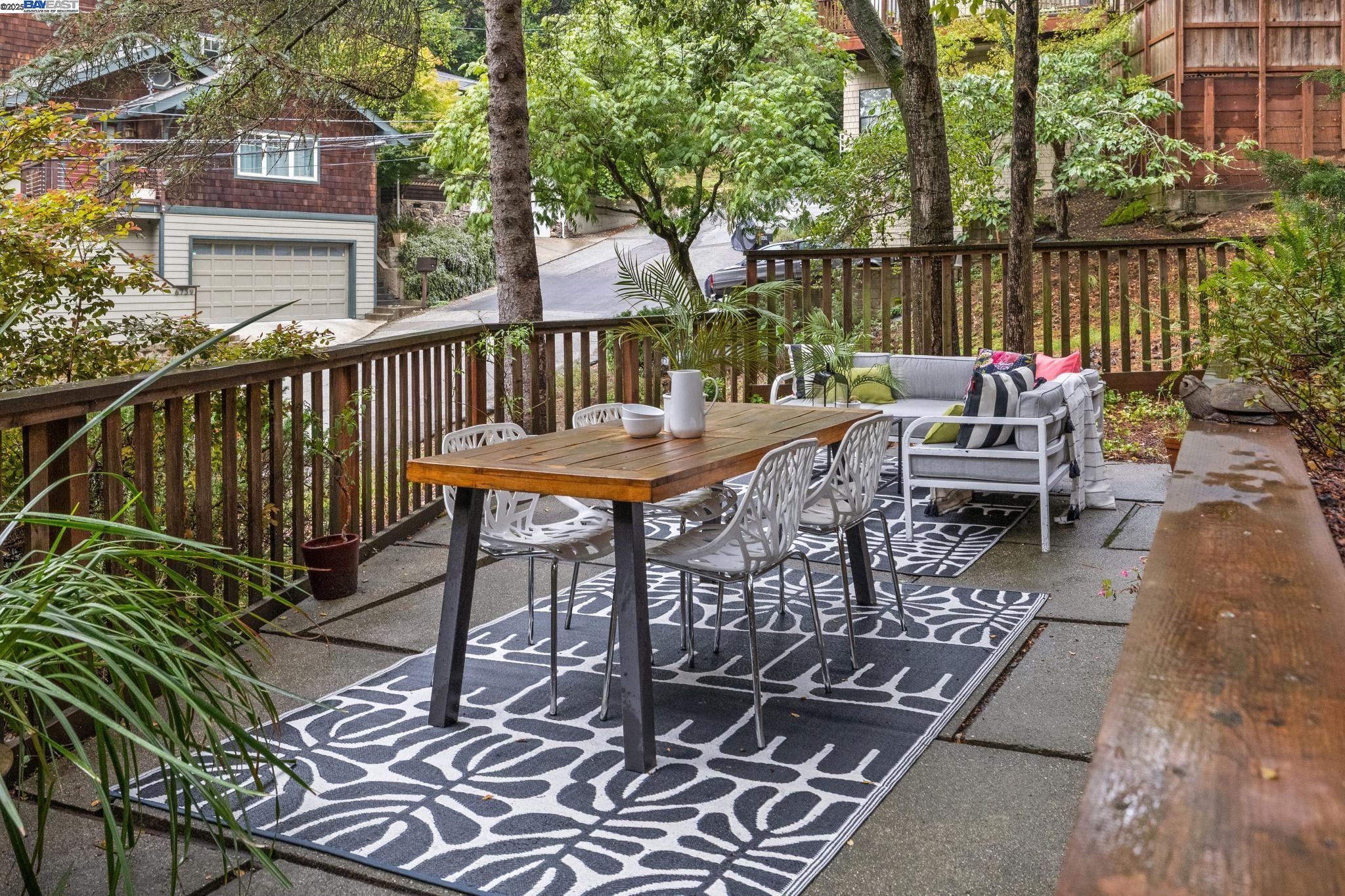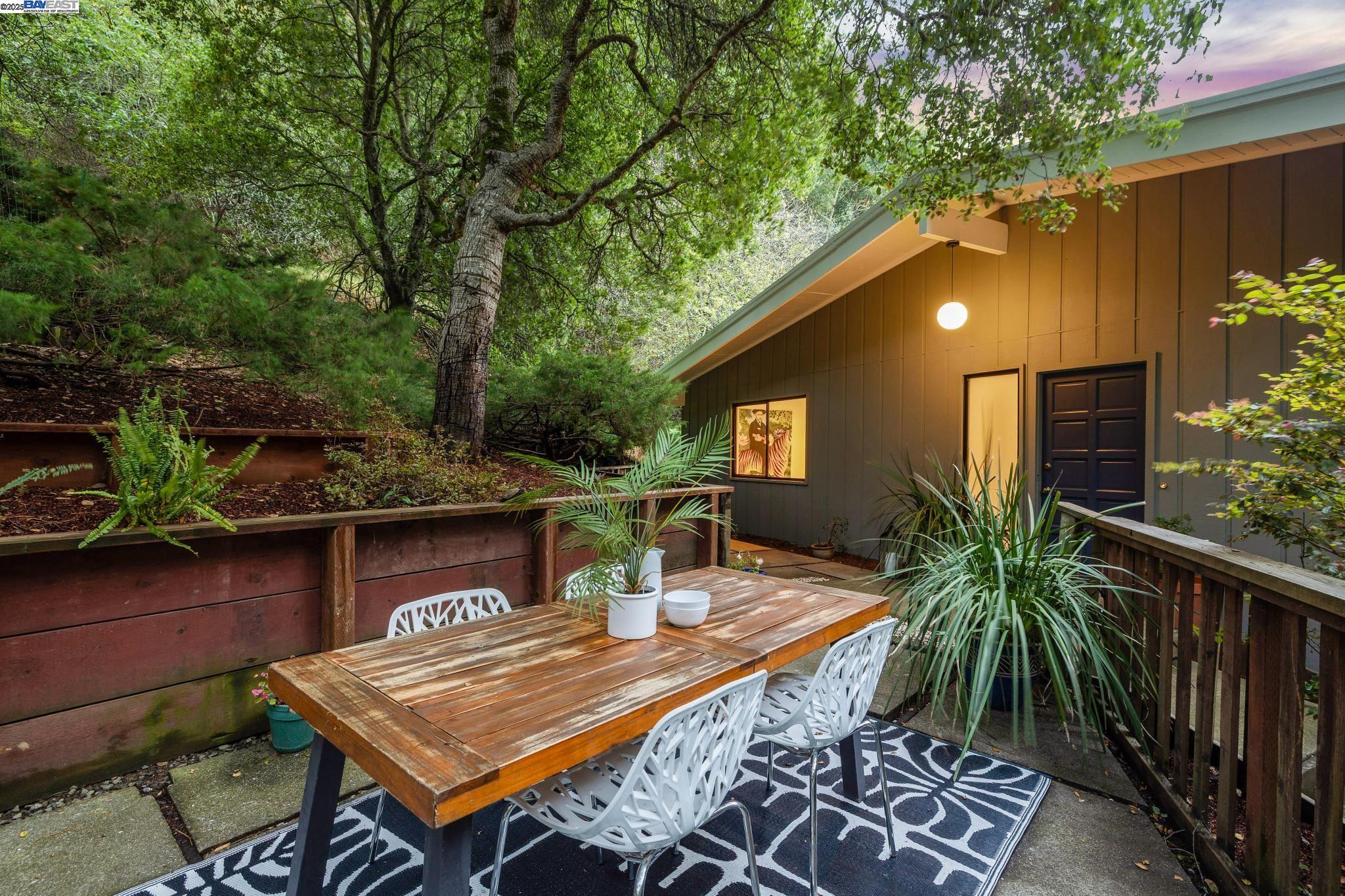 Surrounded by redwoods and beautiful oaks, this upgraded 3BD/2.5BA Montclair home is now transparently priced! The 1709 SQFT home welcomes you with a spacious terrace where you can unwind or entertain encircled by majestic trees and a terraced garden. Step inside the home's open living area that compliments the setting's natural beauty with a soaring beamed ceiling, a statement stone fireplace, and two sliding glass doors onto a new deck that spans the living and dining area. The adjacent stylish kitchen, the open floor plan, and wide deck offer seamless flow and indoor/outdoor living. New hardwood floors continue down the hall featuring a full bath with tub, one bedroom with a garden picture window, and a bright primary bedroom with an ensuite bath. Both bedrooms enjoy roomy closets and new recessed lighting. Downstairs find another private bedroom, half bath, laundry room, and indoor access to the oversized 2-car garage. Venture out the side door to relax or play on the newly refurbished back patio with pavers and raised garden beds. This wooded sanctuary is close to top-rated public schools, the Montclair Swim Club, and lively Montclair Village for shopping and dining; and East Bay Parks for recreation with miles of beautiful trails.