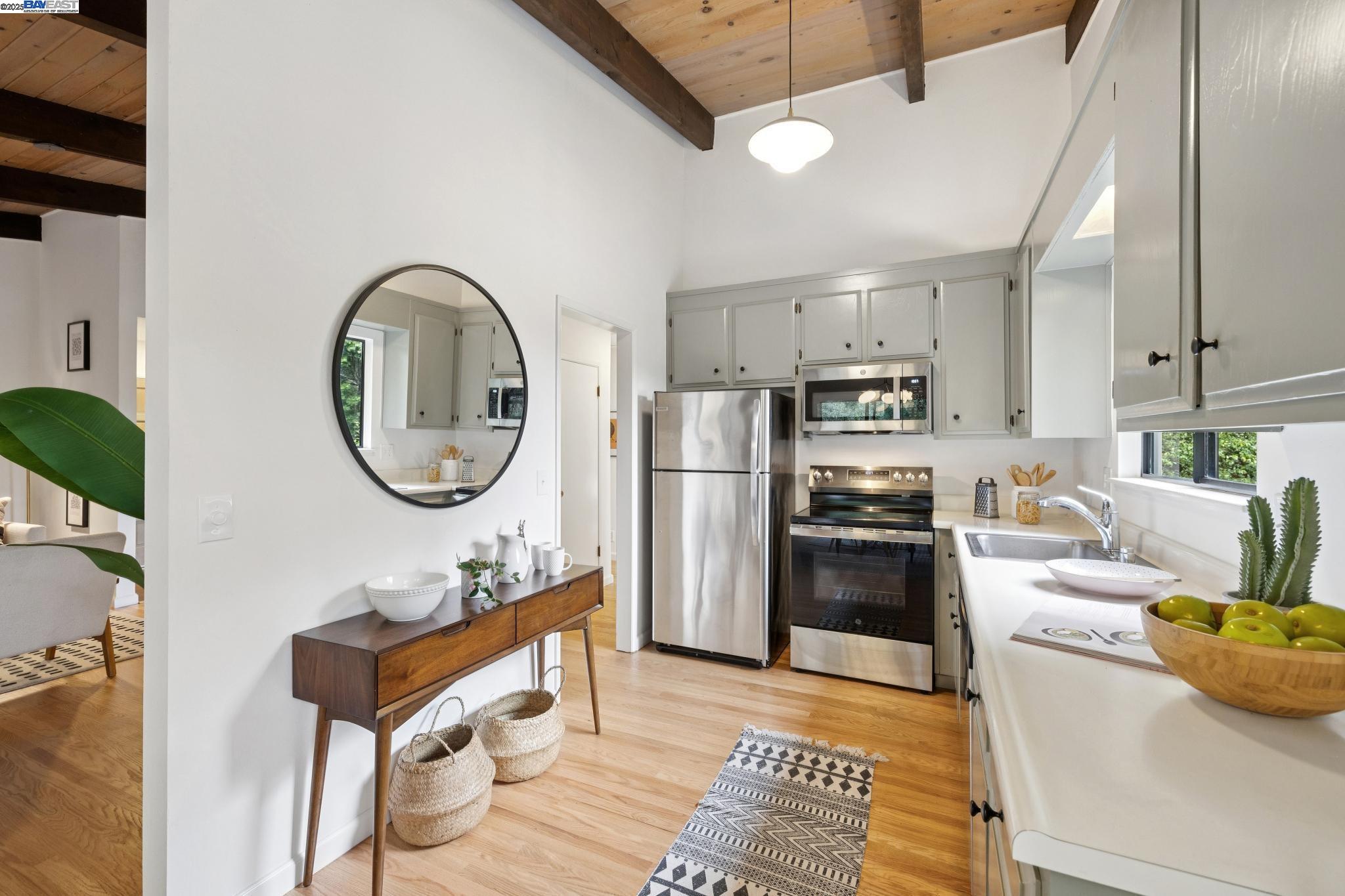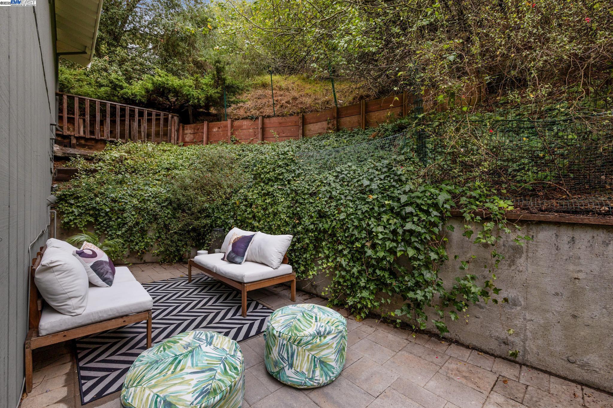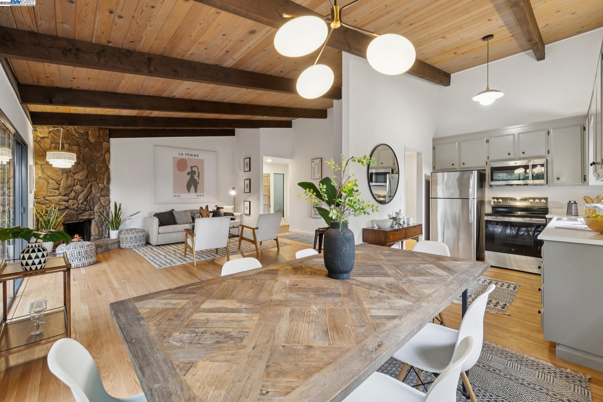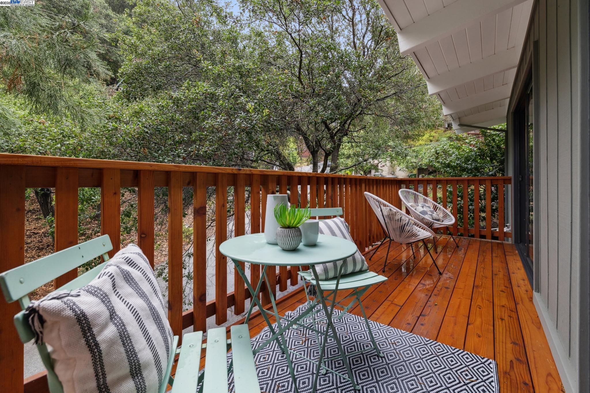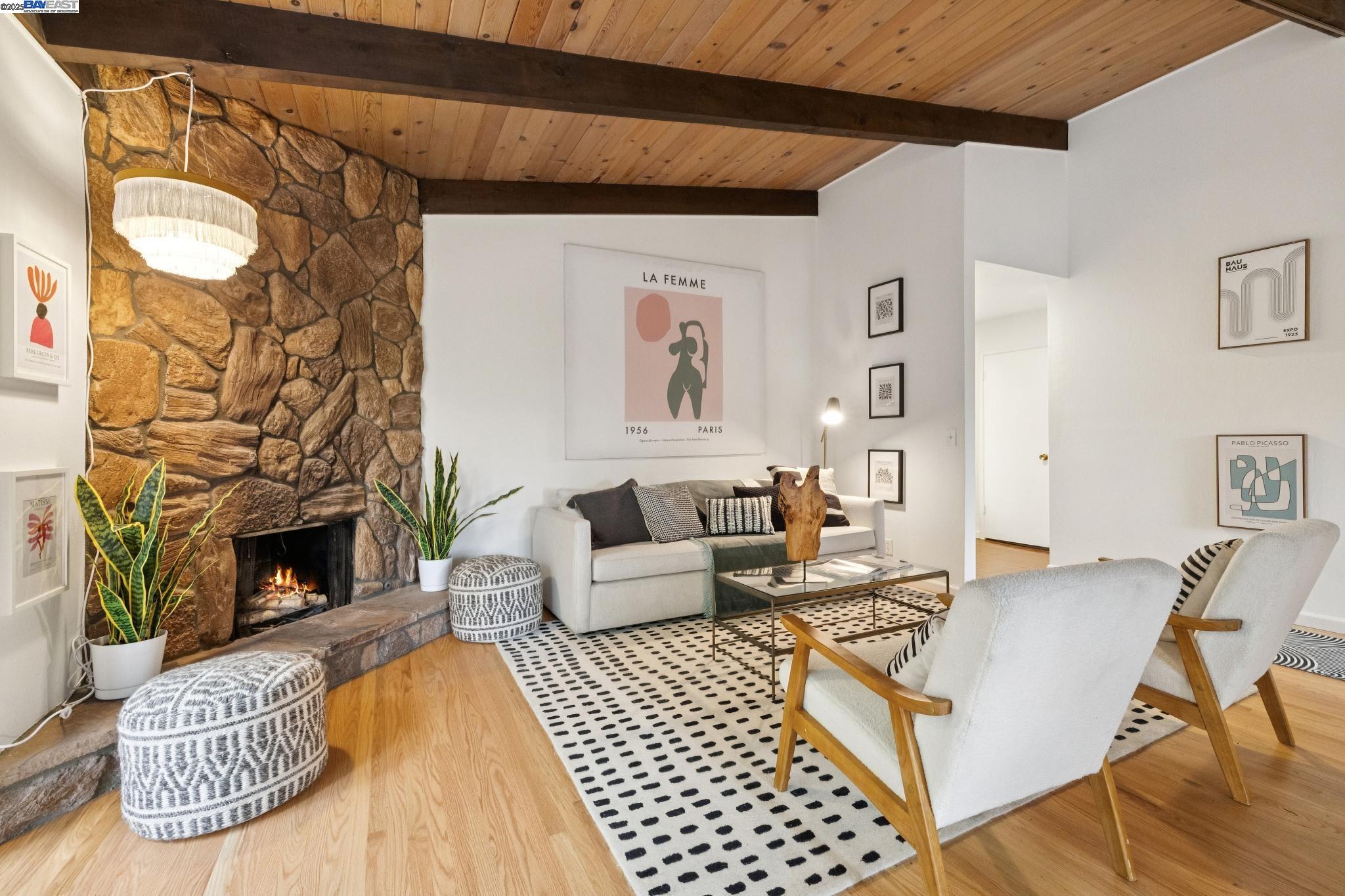 Surrounded by redwoods and beautiful oaks, this upgraded 3BD/2.5BA Montclair home is now transparently priced! The 1709 SQFT home welcomes you with a spacious terrace where you can unwind or entertain encircled by majestic trees and a terraced garden. Step inside the home's open living area that compliments the setting's natural beauty with a soaring beamed ceiling, a statement stone fireplace, and two sliding glass doors onto a new deck that spans the living and dining area. The adjacent stylish kitchen, the open floor plan, and wide deck offer seamless flow and indoor/outdoor living. New hardwood floors continue down the hall featuring a full bath with tub, one bedroom with a garden picture window, and a bright primary bedroom with an ensuite bath. Both bedrooms enjoy roomy closets and new recessed lighting. Downstairs find another private bedroom, half bath, laundry room, and indoor access to the oversized 2-car garage. Venture out the side door to relax or play on the newly refurbished back patio with pavers and raised garden beds. This wooded sanctuary is close to top-rated public schools, the Montclair Swim Club, and lively Montclair Village for shopping and dining; and East Bay Parks for recreation with miles of beautiful trails.