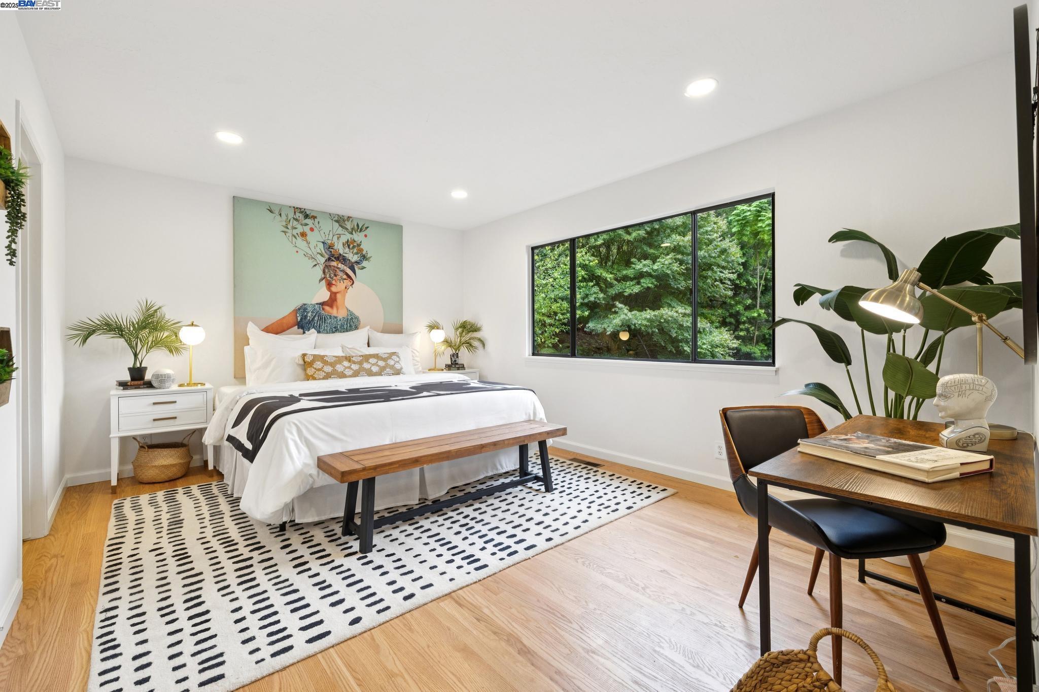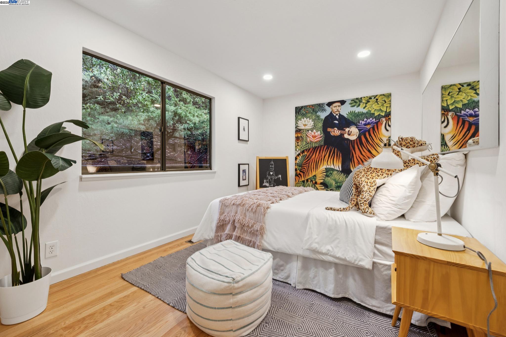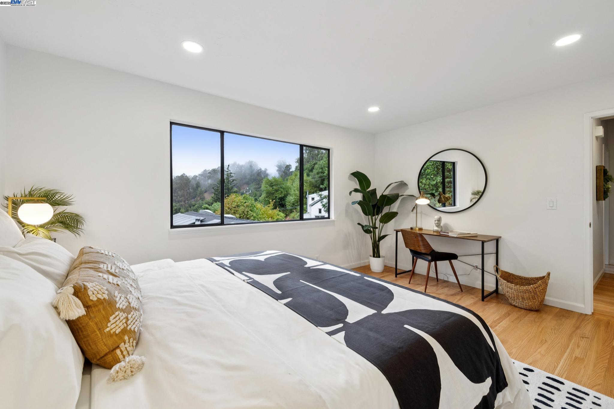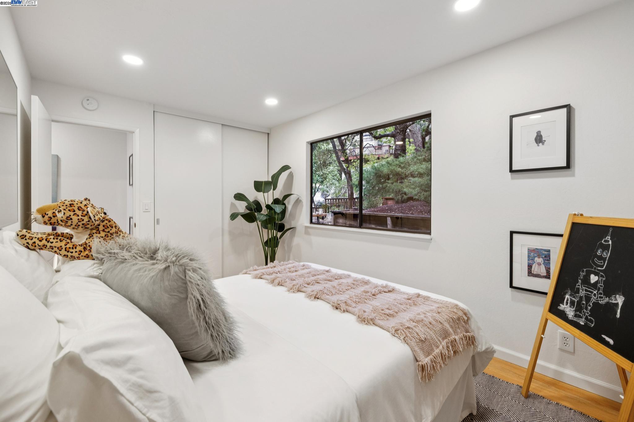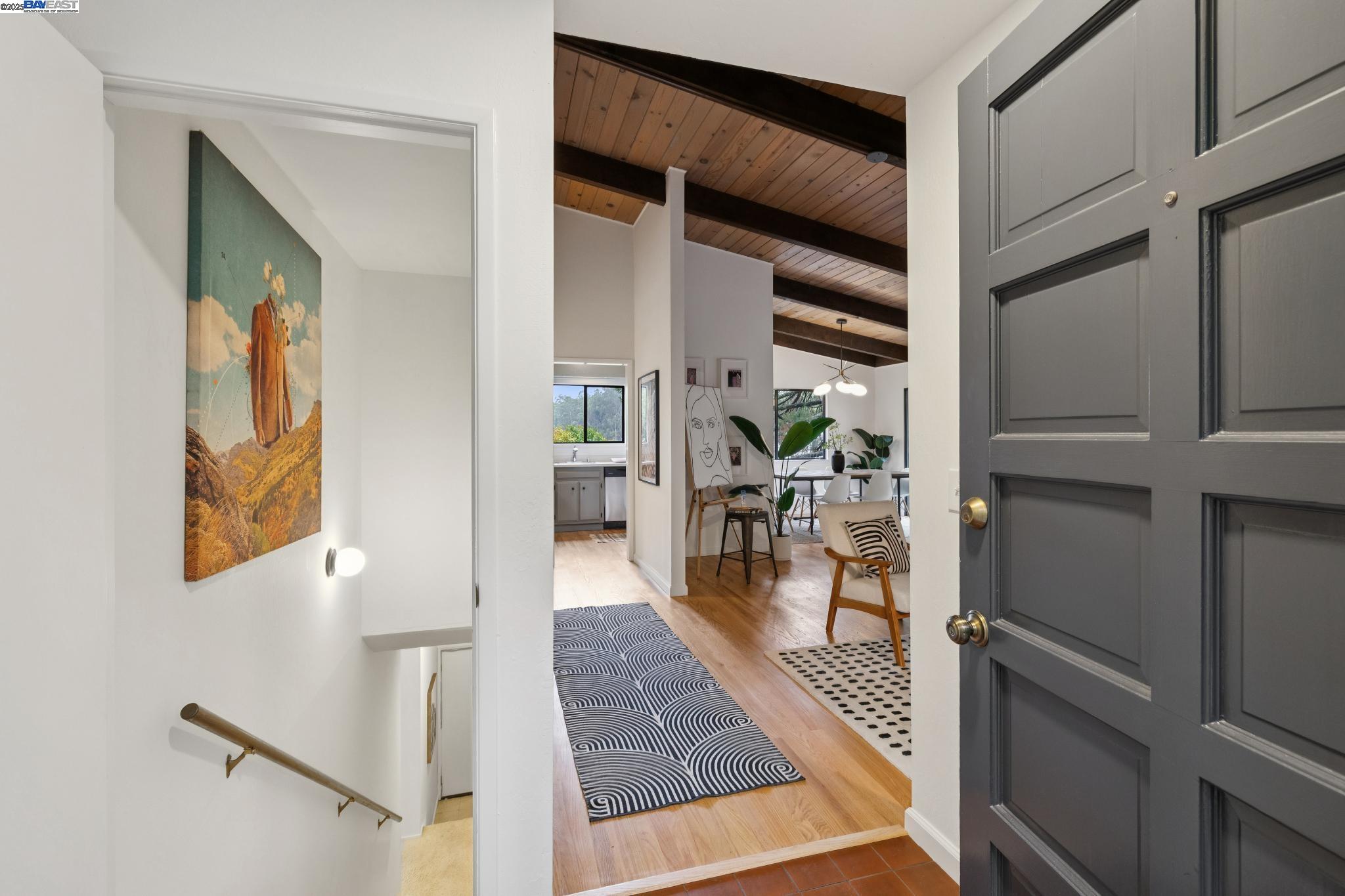 Surrounded by redwoods and beautiful oaks, this upgraded 3BD/2.5BA Montclair home is now transparently priced! The 1709 SQFT home welcomes you with a spacious terrace where you can unwind or entertain encircled by majestic trees and a terraced garden. Step inside the home's open living area that compliments the setting's natural beauty with a soaring beamed ceiling, a statement stone fireplace, and two sliding glass doors onto a new deck that spans the living and dining area. The adjacent stylish kitchen, the open floor plan, and wide deck offer seamless flow and indoor/outdoor living. New hardwood floors continue down the hall featuring a full bath with tub, one bedroom with a garden picture window, and a bright primary bedroom with an ensuite bath. Both bedrooms enjoy roomy closets and new recessed lighting. Downstairs find another private bedroom, half bath, laundry room, and indoor access to the oversized 2-car garage. Venture out the side door to relax or play on the newly refurbished back patio with pavers and raised garden beds. This wooded sanctuary is close to top-rated public schools, the Montclair Swim Club, and lively Montclair Village for shopping and dining; and East Bay Parks for recreation with miles of beautiful trails.
