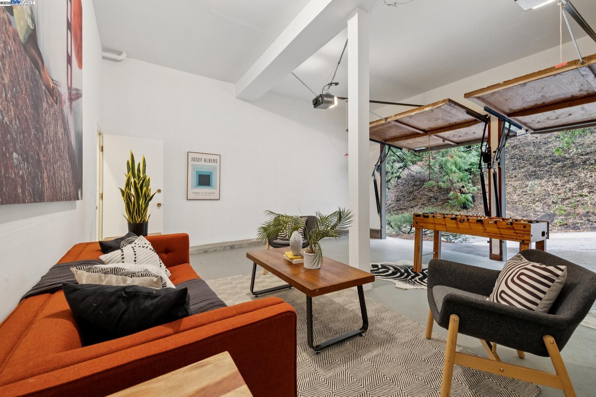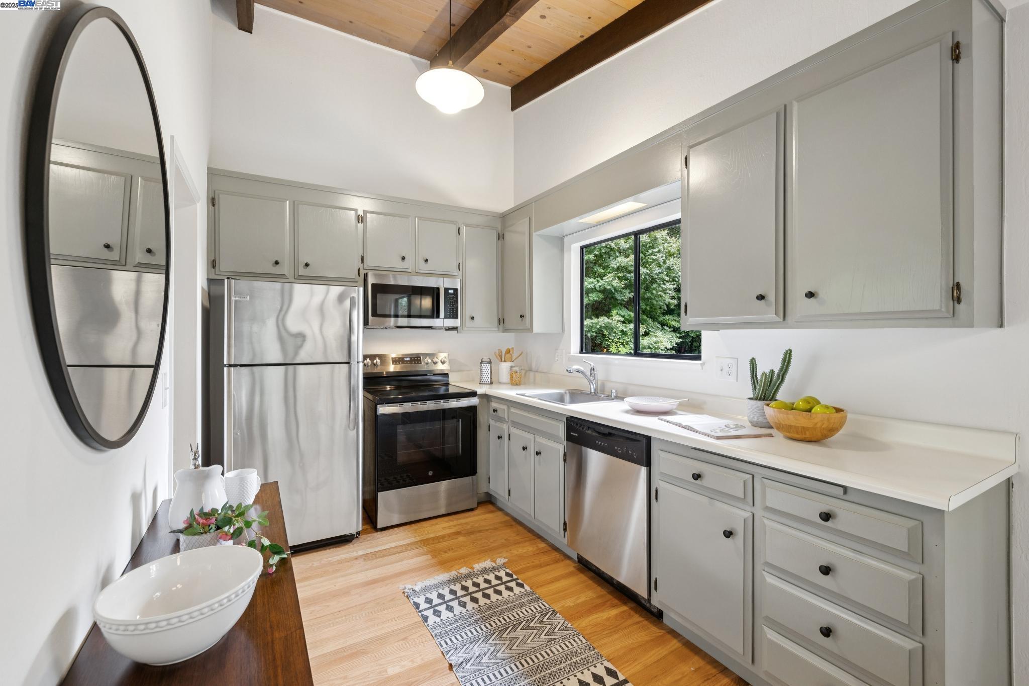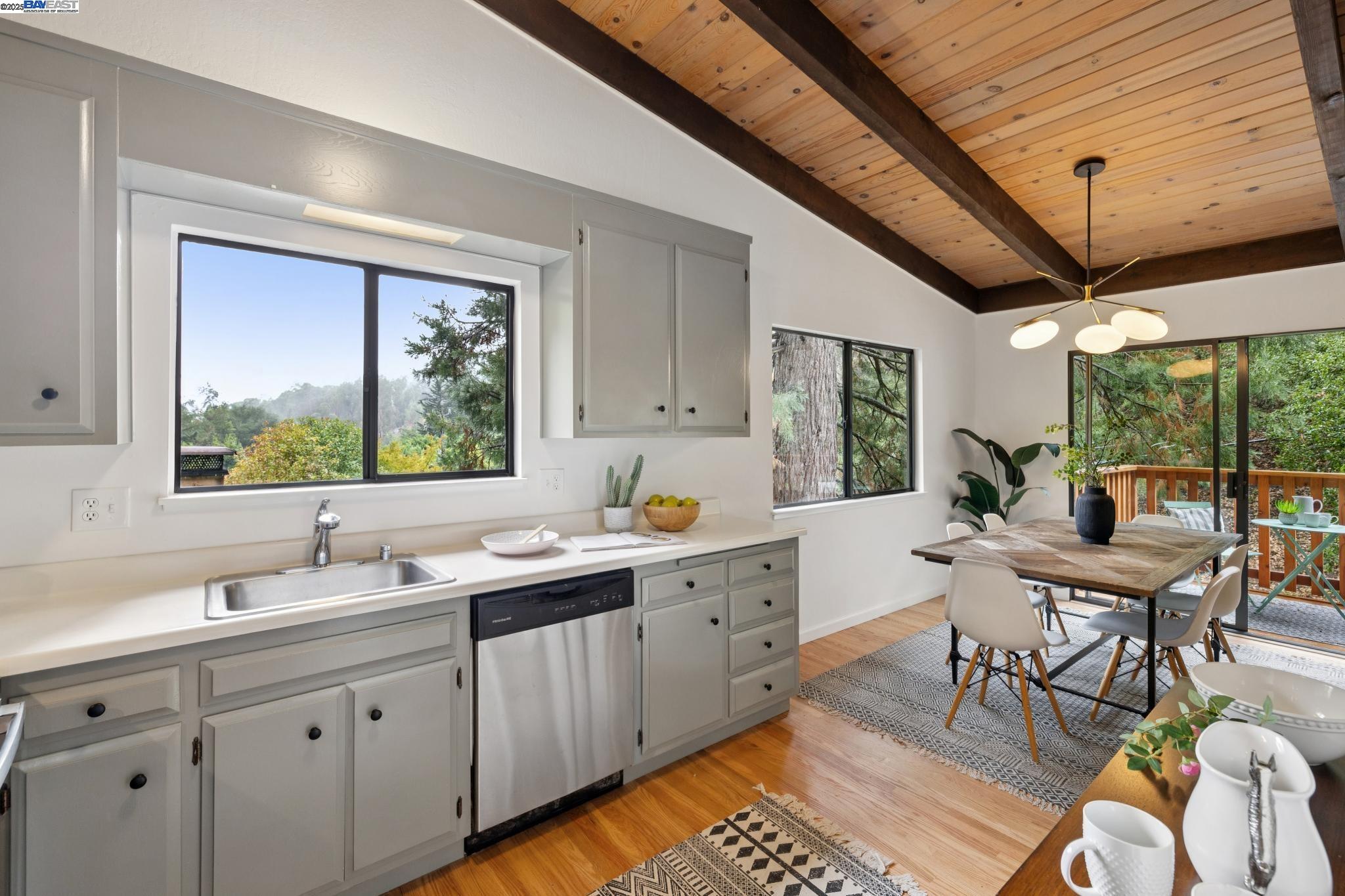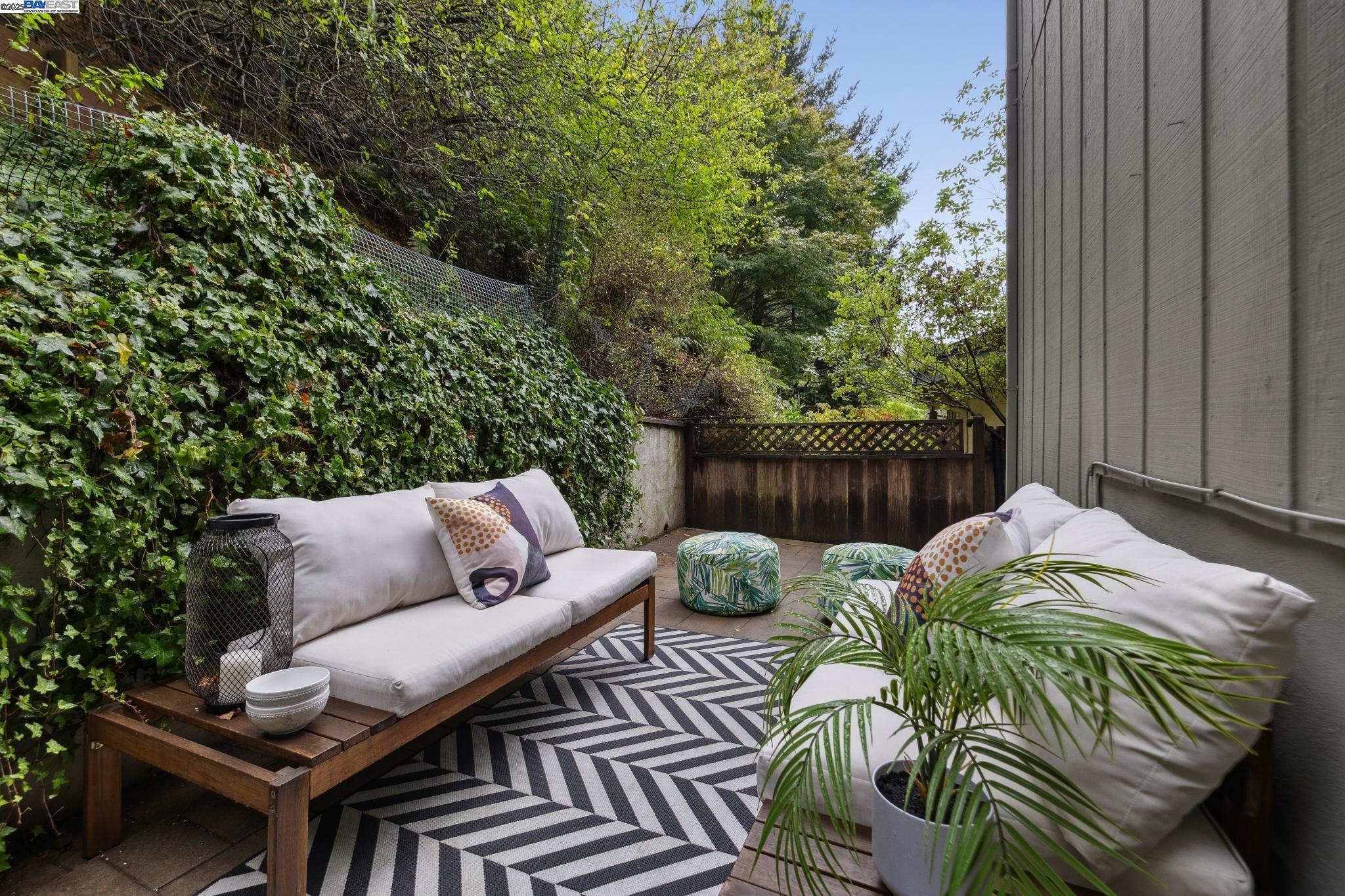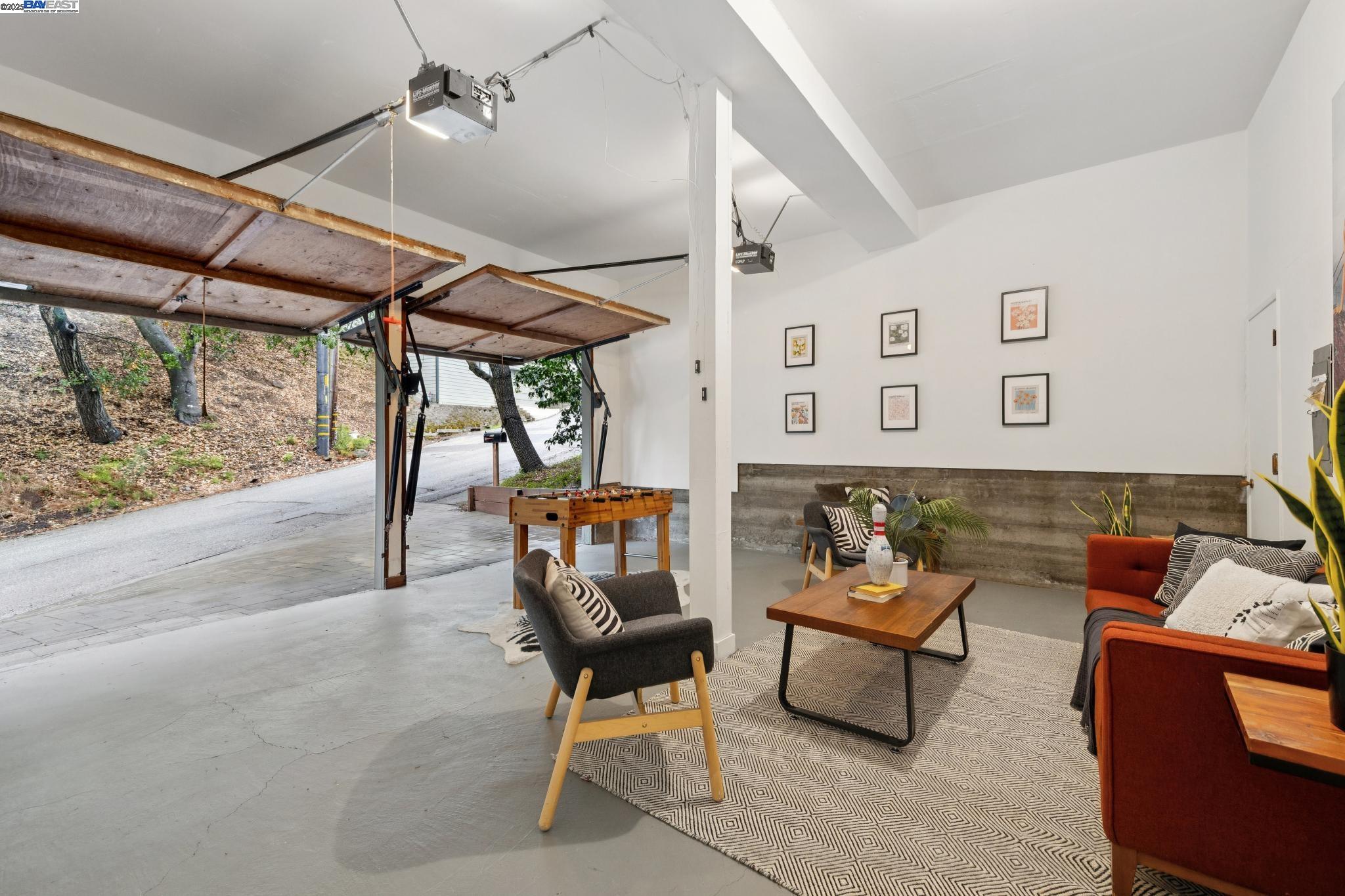 Surrounded by redwoods and beautiful oaks, this upgraded 3BD/2.5BA Montclair home is now transparently priced! The 1709 SQFT home welcomes you with a spacious terrace where you can unwind or entertain encircled by majestic trees and a terraced garden. Step inside the home's open living area that compliments the setting's natural beauty with a soaring beamed ceiling, a statement stone fireplace, and two sliding glass doors onto a new deck that spans the living and dining area. The adjacent stylish kitchen, the open floor plan, and wide deck offer seamless flow and indoor/outdoor living. New hardwood floors continue down the hall featuring a full bath with tub, one bedroom with a garden picture window, and a bright primary bedroom with an ensuite bath. Both bedrooms enjoy roomy closets and new recessed lighting. Downstairs find another private bedroom, half bath, laundry room, and indoor access to the oversized 2-car garage. Venture out the side door to relax or play on the newly refurbished back patio with pavers and raised garden beds. This wooded sanctuary is close to top-rated public schools, the Montclair Swim Club, and lively Montclair Village for shopping and dining; and East Bay Parks for recreation with miles of beautiful trails.